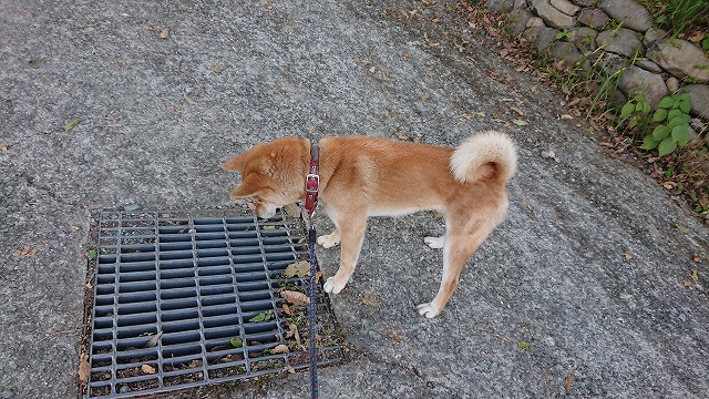 最近、運動不足解消にりゅうちゃんを連れて散歩を始めました。途中、必ずこの蓋の前でしばらく下を眺めています。きっとタヌキの住み家があるのかもしれません。
