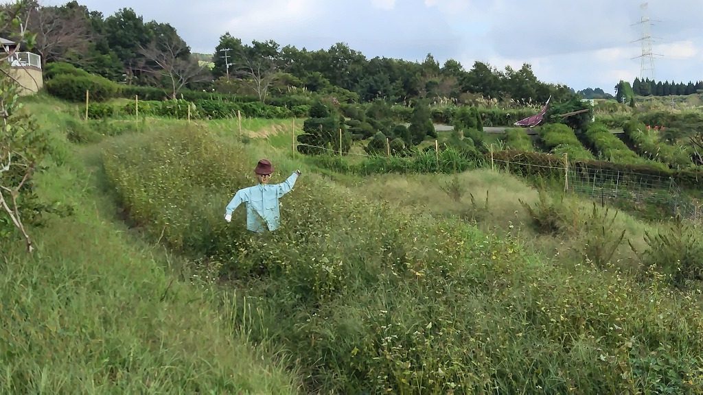 そろそろ蕎麦の収穫が近づいています。鳥がその実を目指して集まってくるので、案山子を設置しました。せっかくなので顔を書いてみました。
