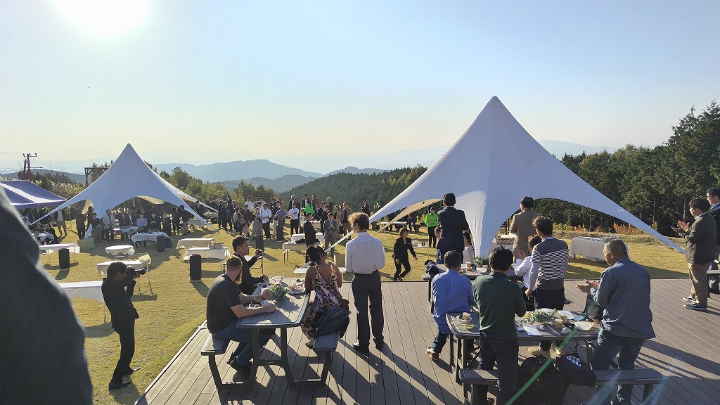 遊心の展望広場で11月3日に結婚式の披露宴がありました。初めての企画なのでプランナーさんたちは式当日までの大変な期間を頑張っていらっしゃいました。前撮りの写真も夕日に合わせてナイスショットな一枚を取られていました。