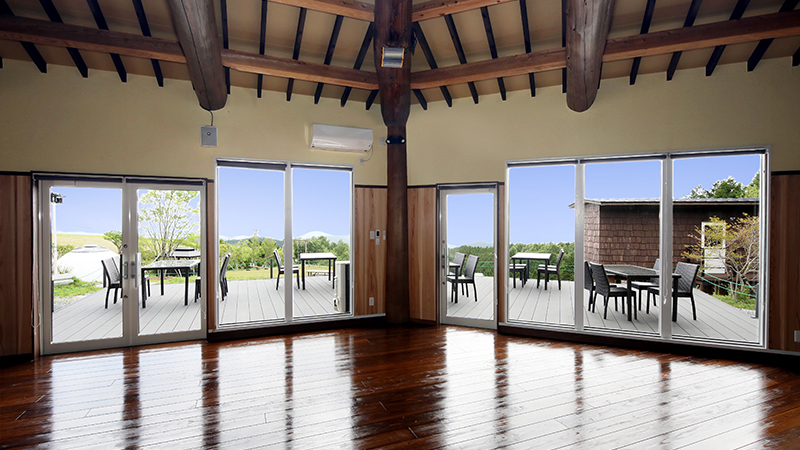 見渡す限りの大自然、爽やかな高原の風。天空にいるかのような遊心の展望広場。展望広場は、CoCokeハウス(多目的ホール)と芝生広場から構成されています。吉無田高原の爽やかな空間の中で 仲間たちとの楽しいひと時を。